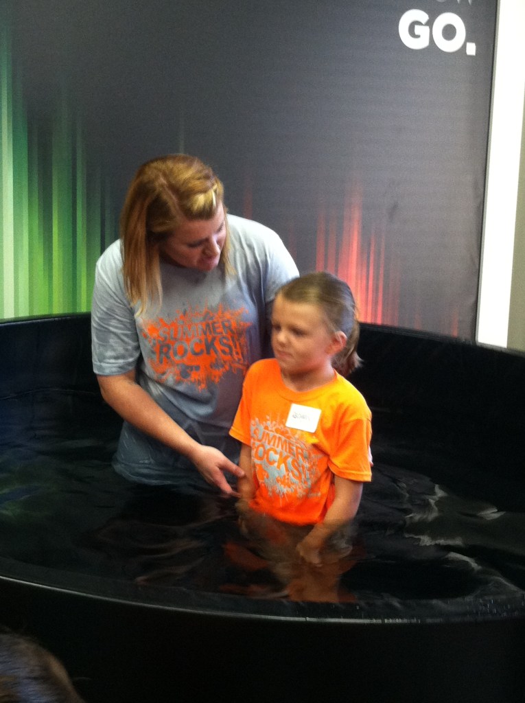 My daughter was 7 years old when she was baptized and we actually tried to deter her. She was young and it wasn’t that she didn’t understand, we just thought it would be better if she understood more. Reagan came home from Summer Rocks (our church’s version of VBS) and knew we were going to the final day “celebration” that night. She also knew there would be an opportunity for her to be baptized. I had the paper they send home with all the parents explaining baptism and what to ask your kid to make sure they understand. We asked all the questions and she answered all the questions but we still told her another time.